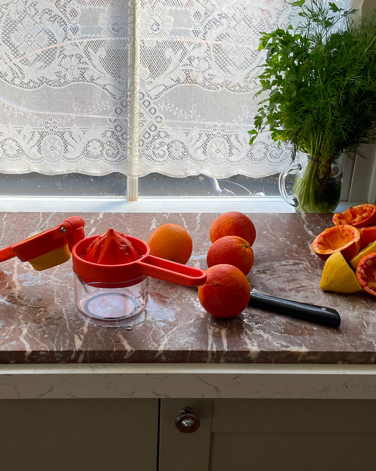 - 400 ml / 420 g Zitrusjus – von etwa 5 großen Blutorangen und 1 großen Zitrone