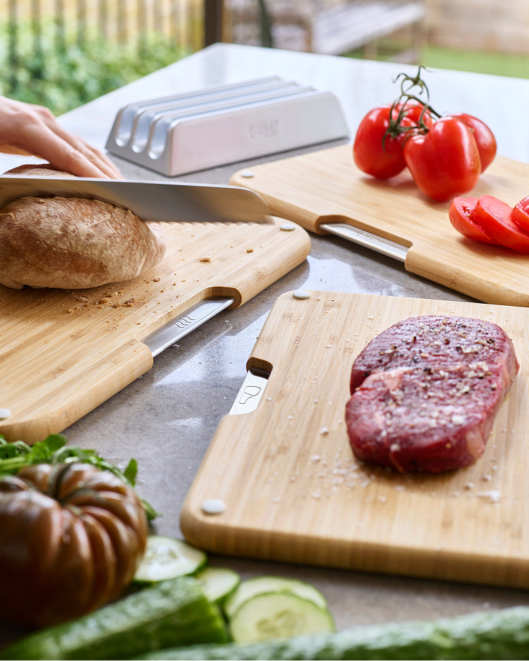 Erhältlich in großen und extra-großen Größen, wird Cut&Carve™ in mehreren Farbausführungen und einer hochwertigen Bambus-Variante für ein besonders robustes Gefühl angeboten.