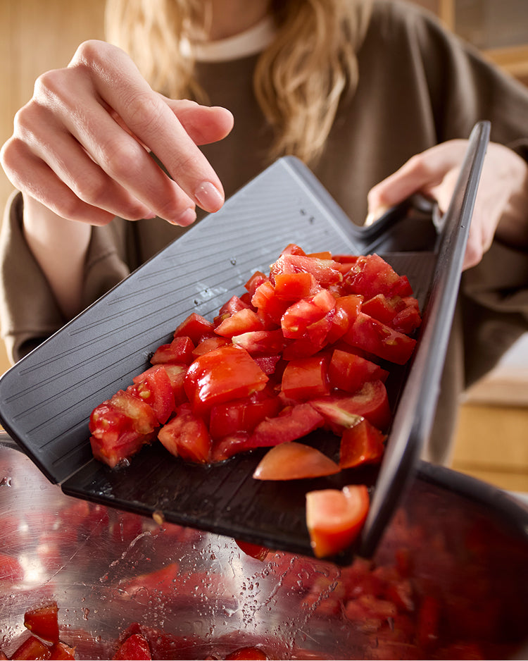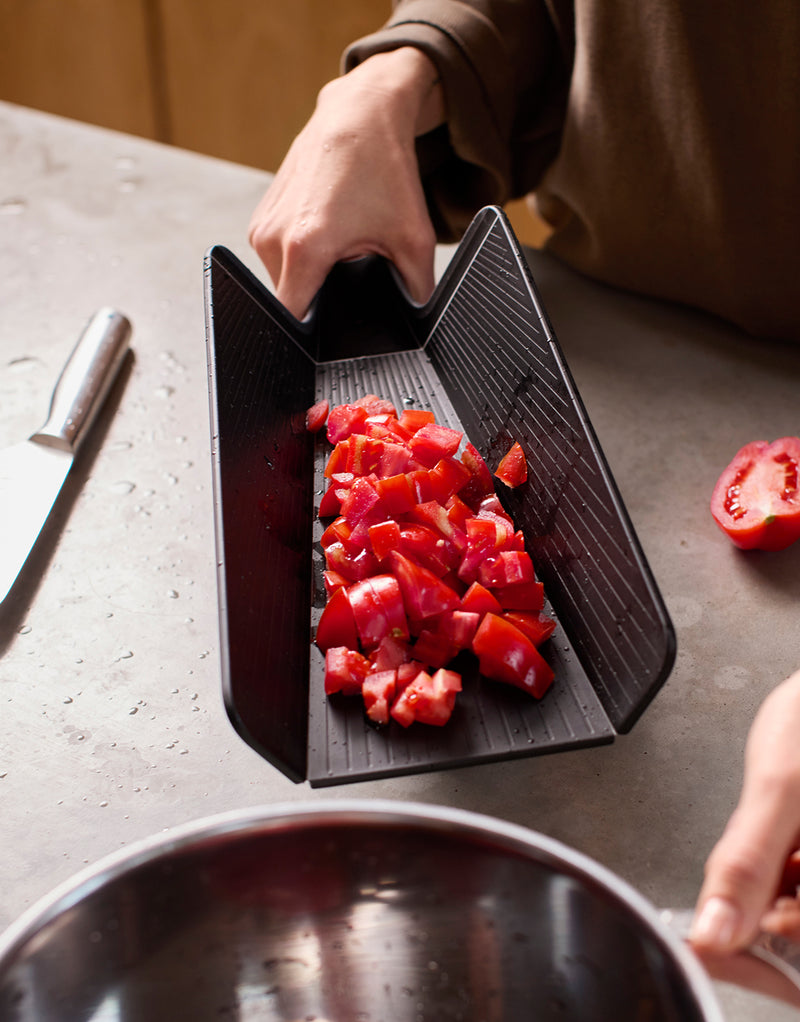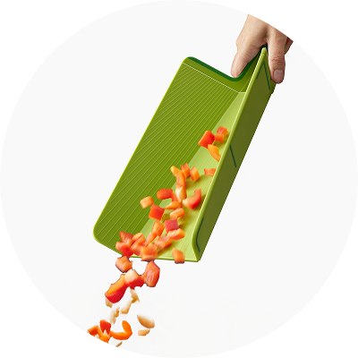 Unser preisgekröntes Schneidebrett Chop2Pot™ beseitigt das Chaos beim Umfüllen von gehackten Lebensmitteln in Töpfe oder von Schnittabfällen in den Kompostbehälter. Das clevere, faltbare Design bildet eine Rinne für einfaches Ausgießen und einen sauberen Lebensmitteltransfer. Drücken Sie einfach den Softgrip-Griff zusammen, und die Seiten des Brettes klappen ein.