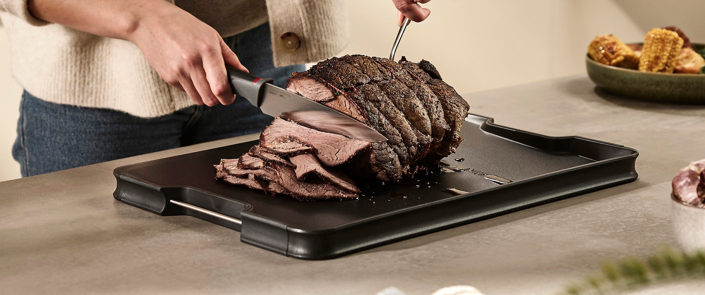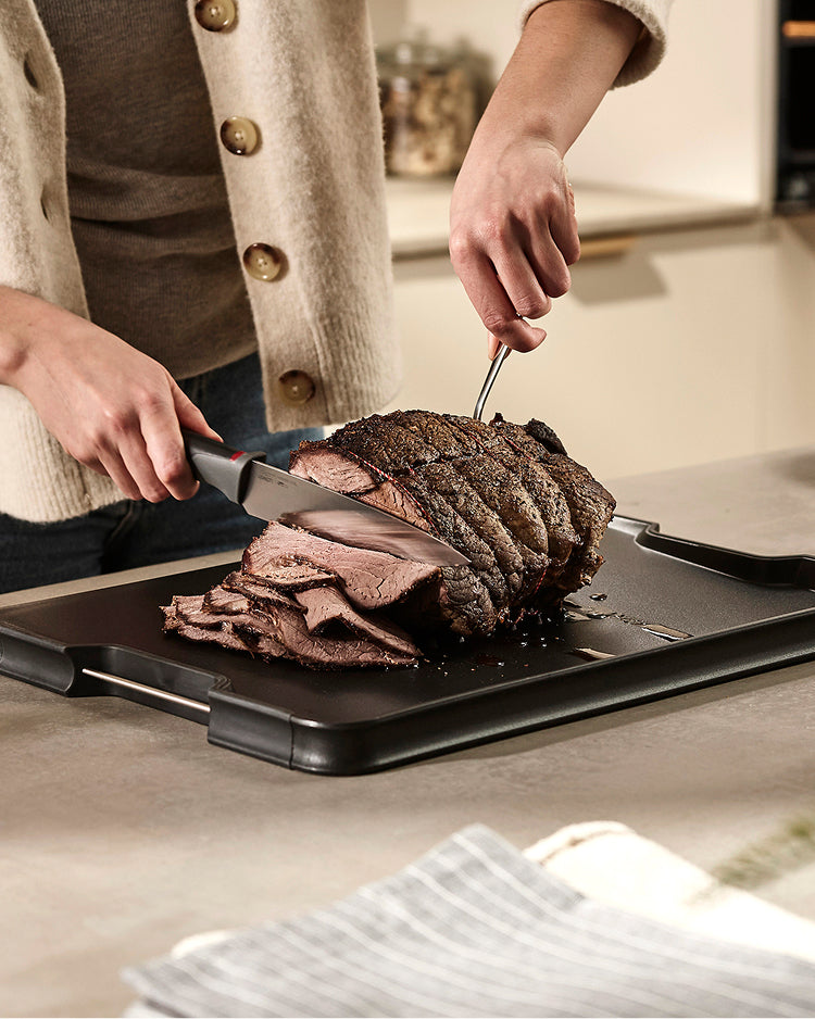 Wie der Name schon sagt, erfüllt Cut&Carve™ zwei Funktionen: Schneiden und Tranchieren. Oft ist es schwierig, große Fleischstücke zu schneiden, da sie auf dem Brett verrutschen und die austretenden Säfte auf die Arbeitsfläche tropfen und dabei Unordnung verursachen können.