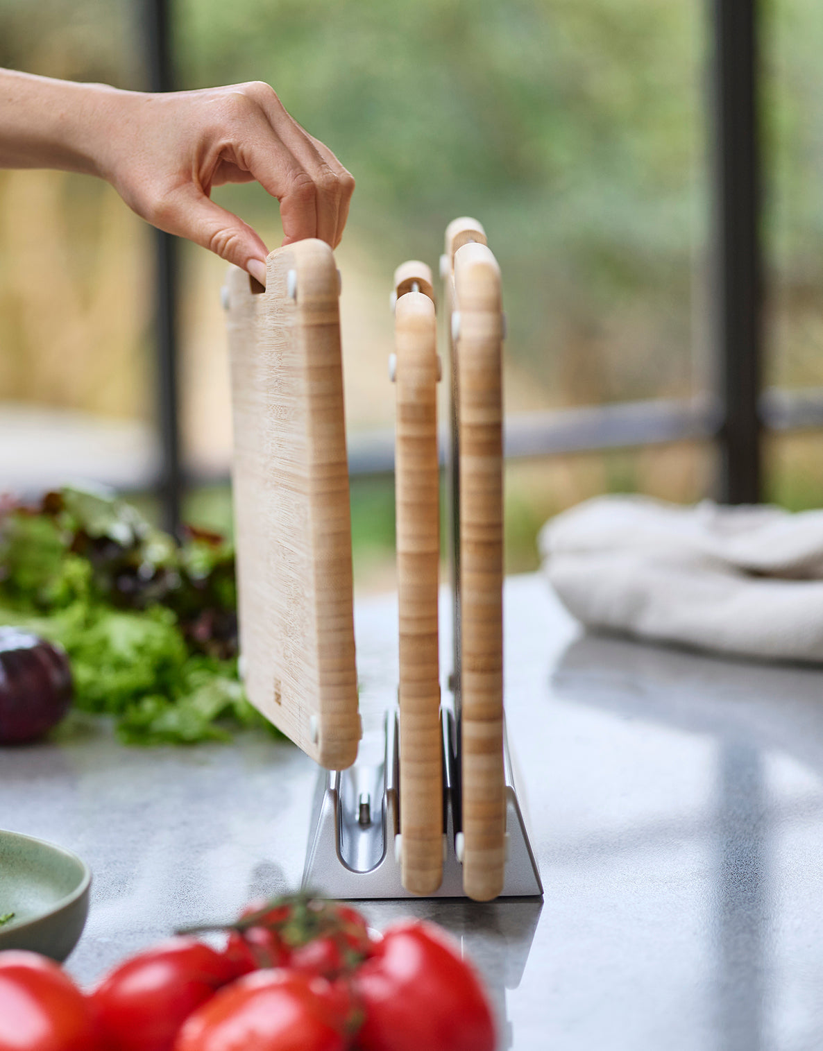 Nest™ ist die unverzichtbare, platzsparende Küchenartikelreihe, die Rührschüsseln, Kochgeschirr, Utensilien und Schneidebretter umfasst. Die 3-teiligen, farbcodierten Schneidebrett-Sets sind von Grund auf platzsparend und verfügen über einen ordentlichen, übersichtlichen Aufbewahrungsständer, der die Bretter leicht auseinander hält, um die Luftzirkulation zu verbessern. Edelstahlstangen ermöglichen eine einfache Auswahl der Bretter aus dem Ständer, während die messerfreundlichen, strukturierten Schneidflächen das Schneiden besonders angenehm machen. Erhältlich in regulären oder großen Größen, sind sie für alle Arten von Küchen und Schneidaufgaben konzipiert.