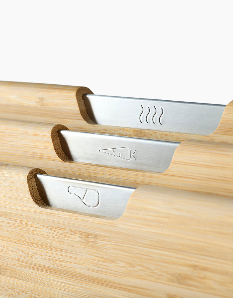 Unsere (alles andere als) gewöhnlichen Folio™-Sets verfügen über ein abgestuftes Design und vier doppelseitige Bretter mit messerschonenden, strukturierten Schneidflächen sowie rutschfesten Füßen für Sicherheit beim Schneiden. Das Etui hält die Bretter zudem auf Abstand, sodass Luft zirkulieren kann und sie effizient trocknen.