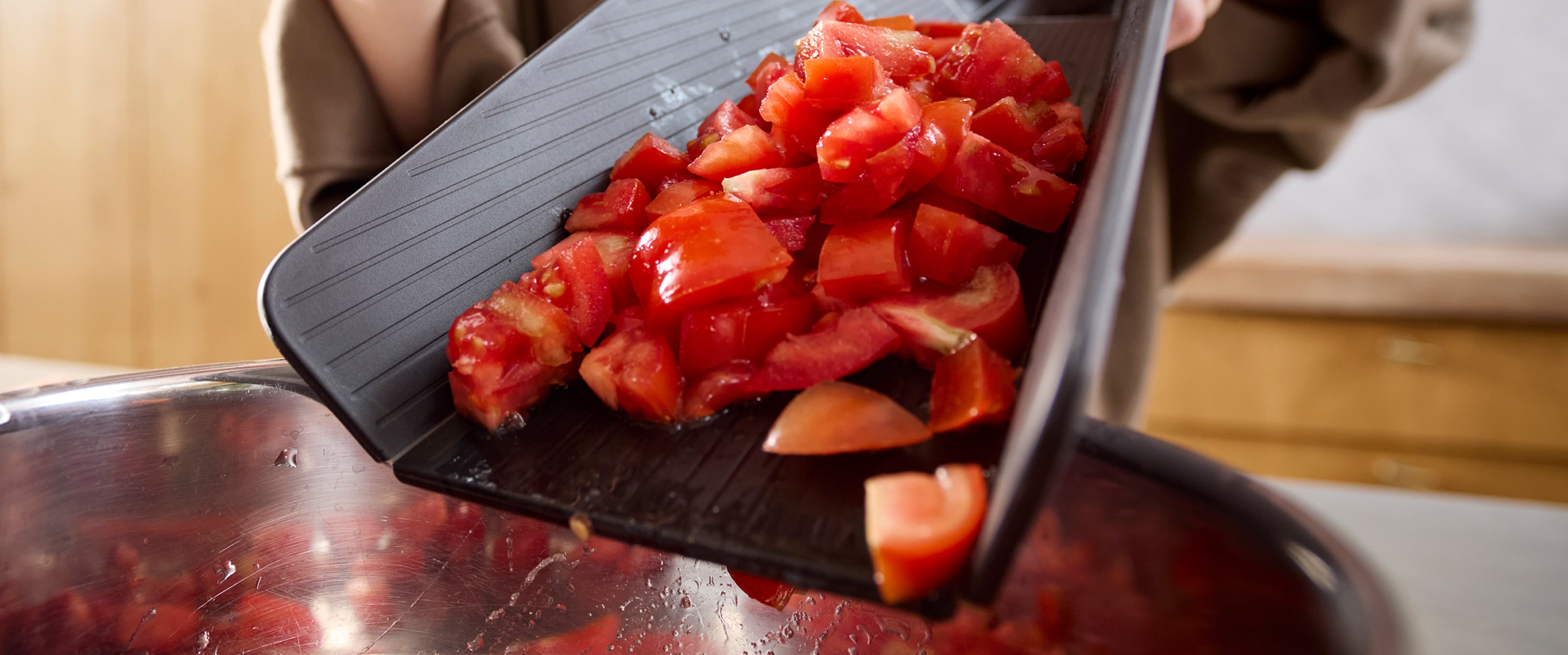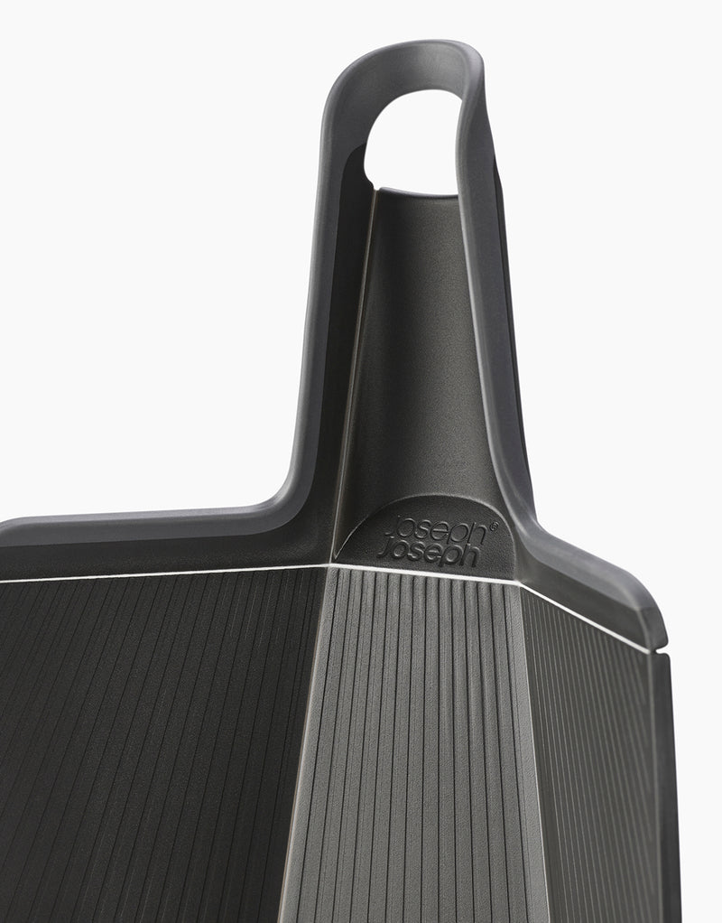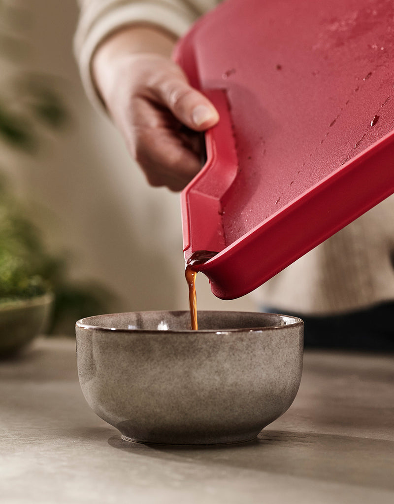 Das in zwei Größen angebotene Chop2Pot™ ist messerfreundlich, rutschfest, wenn es flach liegt, und in verschiedenen Farben erhältlich. Dieses einzigartige Konzept ist auch in natürlichem Bambus erhältlich, der eine dichtere Oberfläche zum Schneiden bietet und gleichzeitig das clevere Klappdesign beibehält.