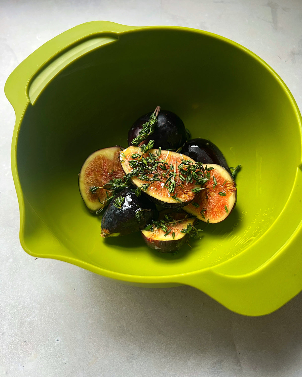 - Step 2Die Feigen mit etwas Olivenöl, Pfeffer und der Hälfte des Thymians mischen. Mit der Schnittseite nach unten in die Pfanne legen. Wenn sie karamellisiert sind, wenden. Noch etwa eine Minute lang kochen lassen und aus der Pfanne nehmen.