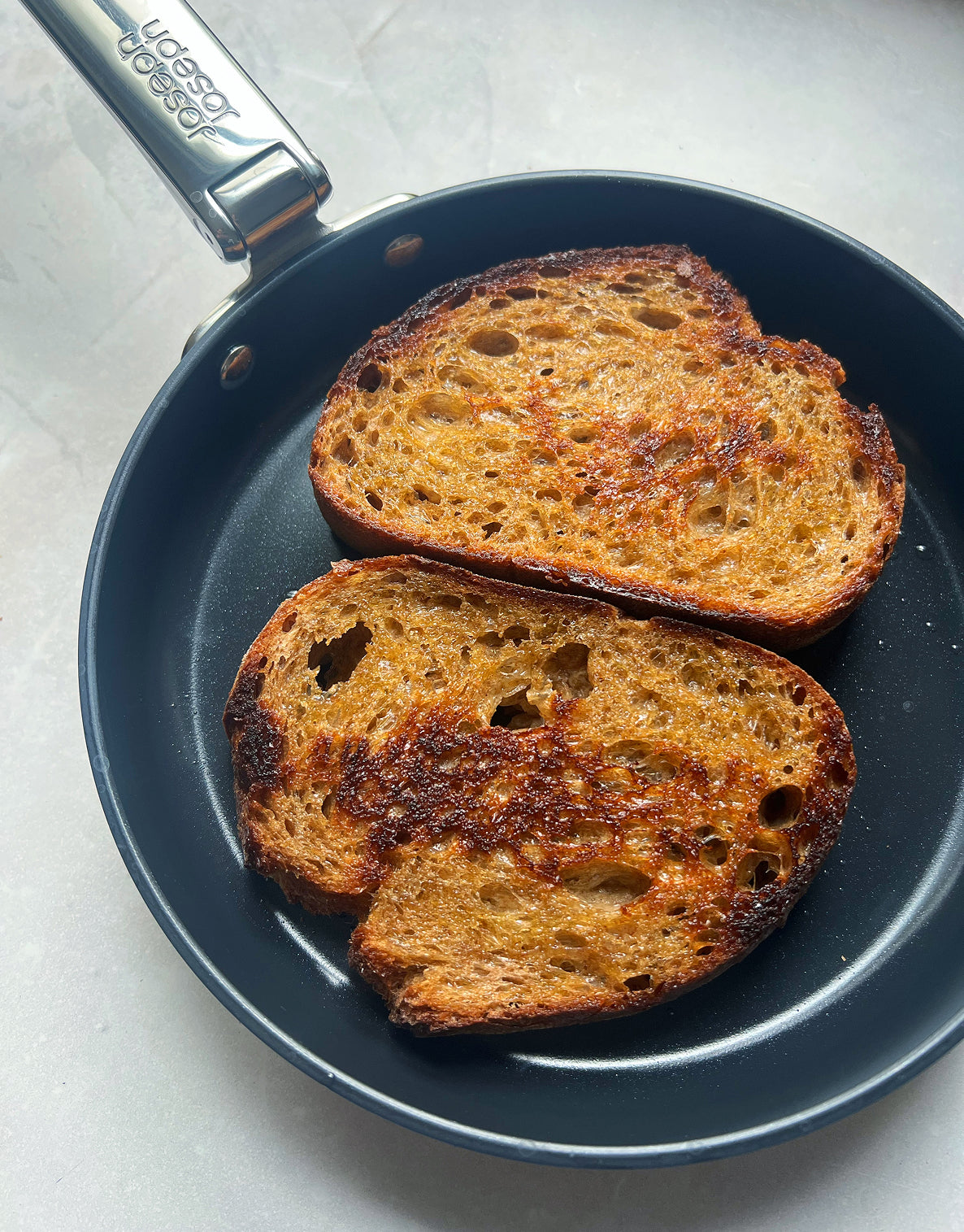 - Step 1Das Brot auf beiden Seiten mit etwas Olivenöl bestreichen und in einer Pfanne bei mittlerer Hitze von beiden Seiten toasten. Aus der Pfanne nehmen.