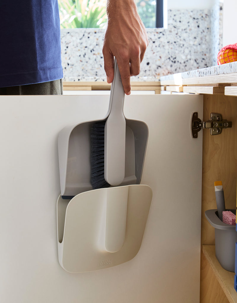 Kehrschaufeln und Bürsten gibt es in allen Formen und Größen, aber es ist oft schwierig, einen geeigneten Platz für sie zu finden. Unsere CleanTech™ Wandmontierte Kehrschaufel und Bürste ist einzigartig, da sie hygienisch in einem Dust-shield™ Halter aufbewahrt werden kann. Die robuste Bürste und die Schaufel lassen sich zur übersichtlichen Aufbewahrung zusammenstecken, und die Schaufel hat einen Gummirahmen für effizienteres Kehren.