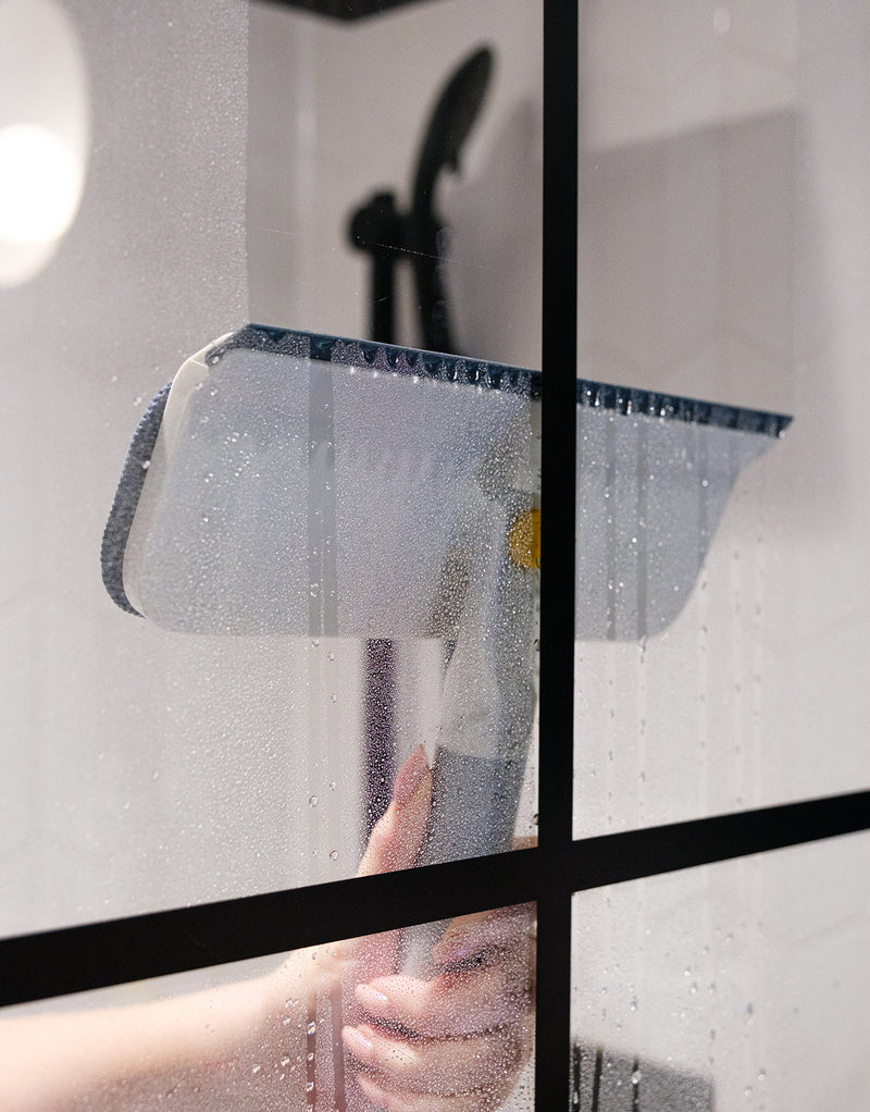 Fingerabdrücke, Spritzer und Zahnpastaflecken... der Badezimmerspiegel hat einiges zu ertragen. Um ihn von seiner besten Seite zu zeigen, ist unser CleanTech™ Glasreinigungsabzieher unverzichtbar, da er zwei Seiten hat, eine mit einem Mikrofasertuch zum Reinigen und die andere mit einem Abzieher für eine makellose Oberfläche. Alternativ ist das Waschen mit einem Mikrofasertuch in kreisenden Bewegungen eine gute Option, gefolgt von einem Abwischen mit einem trockenen Tuch für einen streifenfreien Glanz.