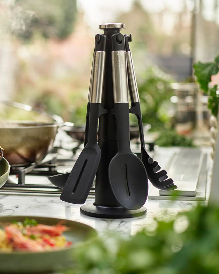 Meistern Sie die Kunst der Omelettzubereitung mit einem Schlitzwender aus Silikon. Das elegante Design ermöglicht ein einfaches Umdrehen und schützt gleichzeitig Ihre Antihaftpfannen. Das Elevate™ Edelstahl-Silikon-5-teilige Küchenutensilien-Karussell hält Unordnung