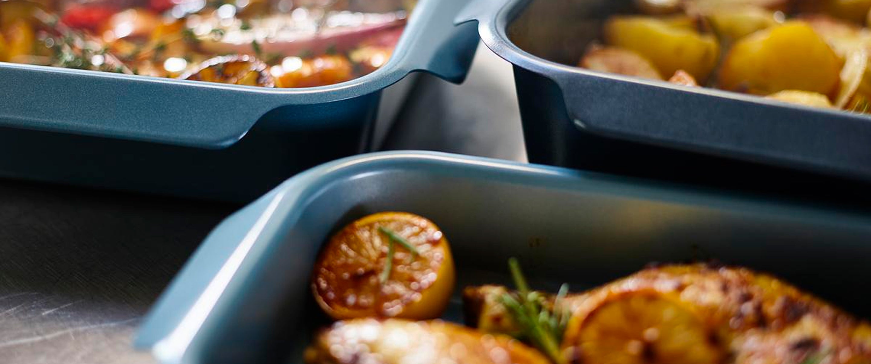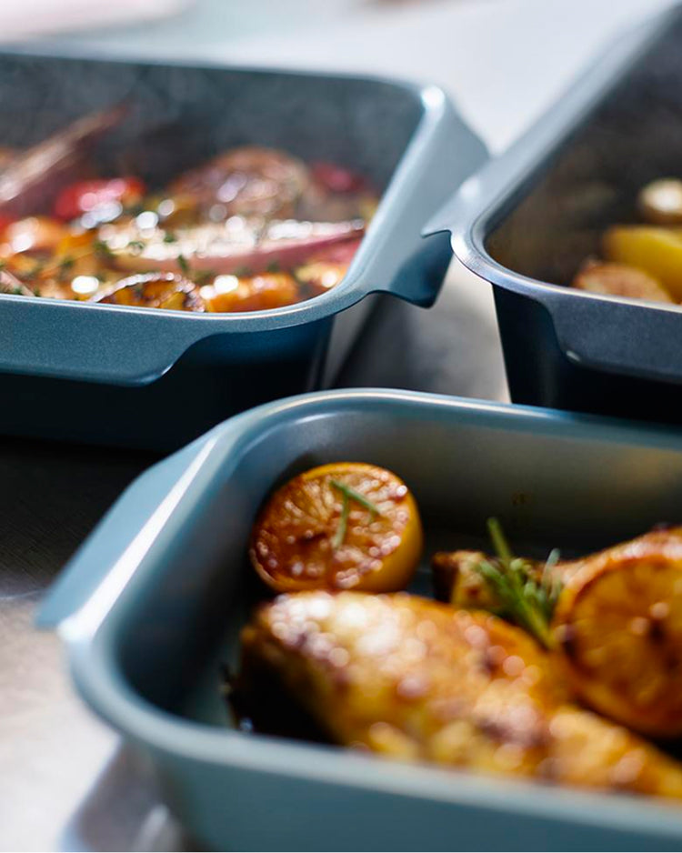 Für alle, die gerne backen, sind die Nest™-Röstbleche unentbehrlich. Diese Antihaft-Bleche sind für eine gleichmäßige Wärmeverteilung konzipiert und eignen sich daher ideal für Kekse, das Rösten von Gemüse oder Sonntagsbraten. Dank der rutschfesten Griffe berühren Sie Ihr Essen beim Herausnehmen aus dem Ofen nicht versehentlich. Außerdem lassen sie sich aufeinander stapeln, was eine ordentliche Aufbewahrung ermöglicht.
