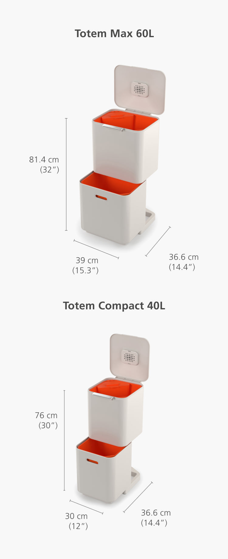 Unsere Mülleimer bieten große Kapazitäten bei kleineren Maßen, denn wir wissen, dass Bodenfläche im Haushalt kostbar ist. Jeder unserer Haushaltsmülleimer bietet besondere Funktionen, sei es durch separate Fächer in einem ordentlichen Turm (Totem), die Möglichkeit, Müll zu komprimieren, um die Anzahl der Gänge zu den Mülltonnen zu reduzieren (Titan), oder durch Mülleimer, in denen sich Müllsäcke bequem verstauen lassen (Arc™).