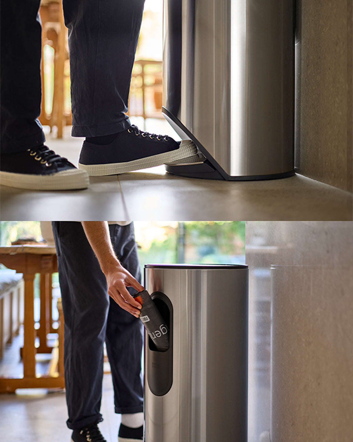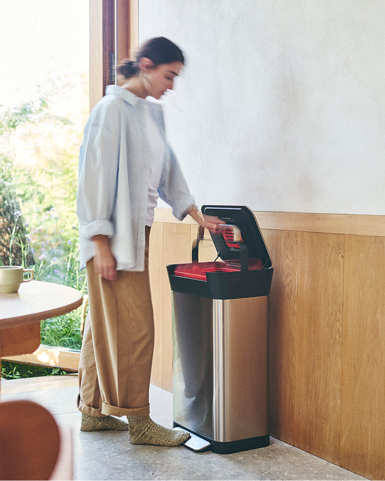 Wenn Sie eine optimierte Müllentsorgung wünschen, sollten Sie sich den Arc™ ansehen, der über ein integriertes Pedal verfügt. In der praktischen Tasche an der Rückseite können Sie die Müllsäcke aufbewahren, sodass Sie immer welche zur Hand haben, wenn Sie sie am dringendsten benötigen. Der Arc™ fasst 30 Liter Müll und ist auch in einem kleineren 10-Liter-Format erhältlich. Fußpedale sind besonders praktisch, wenn Sie gerade mit schmutziger Küchenarbeit beschäftigt sind und den Mülleimer nicht mit den Händen öffnen möchten. Der Deckel schließt sich sanft und leise.