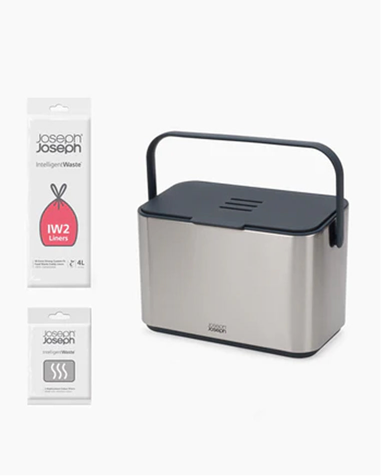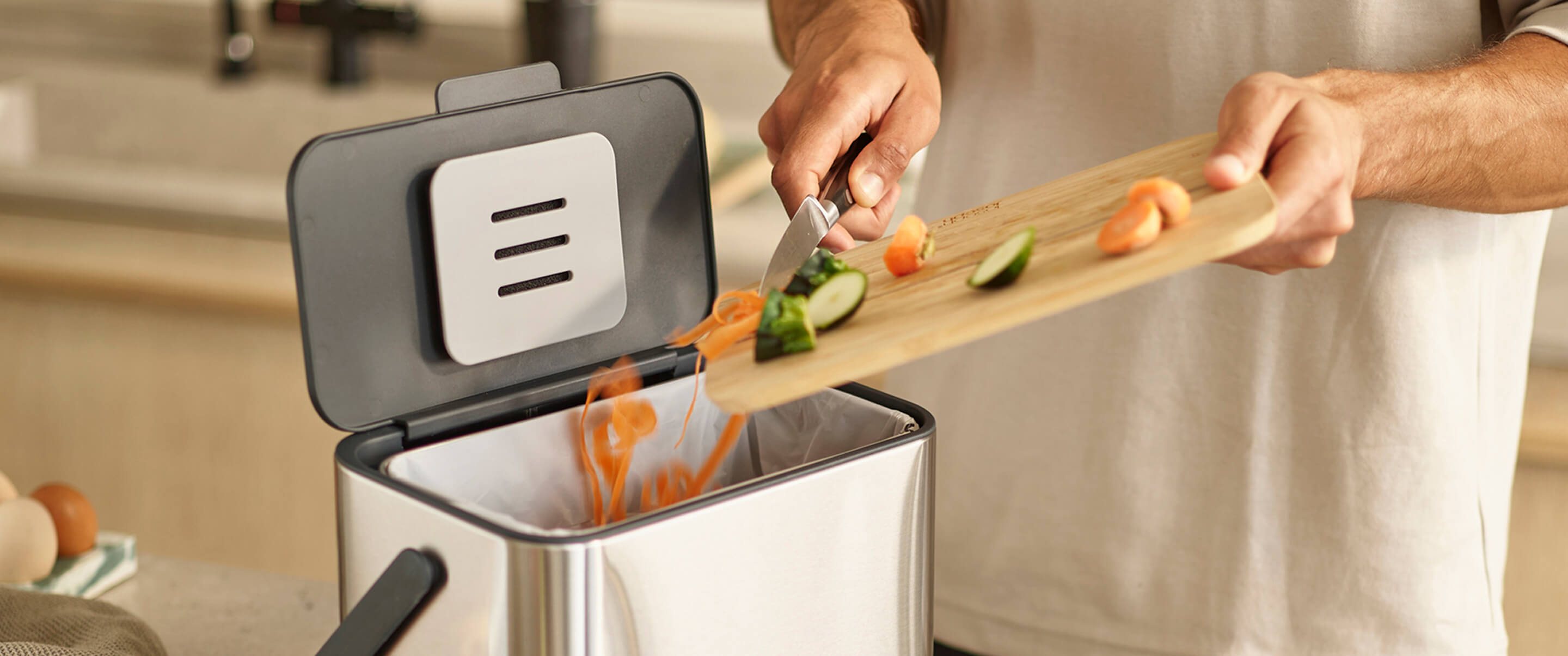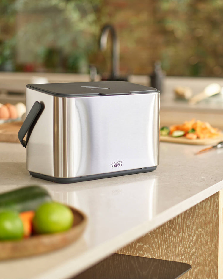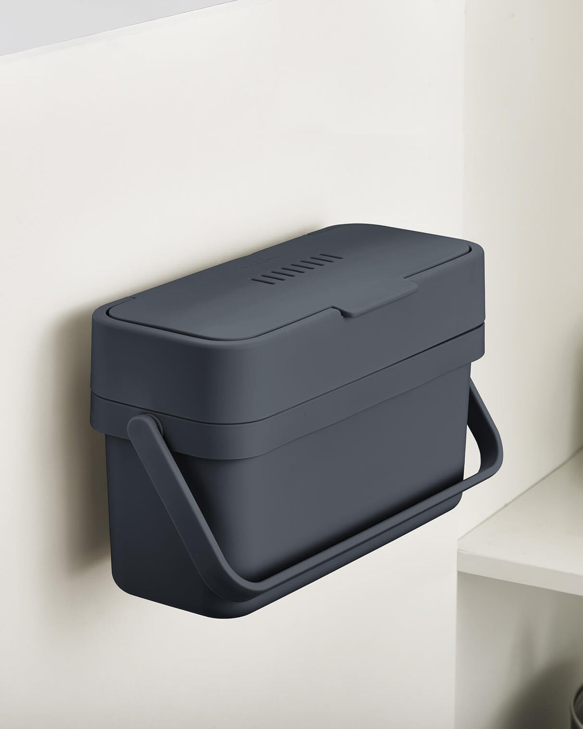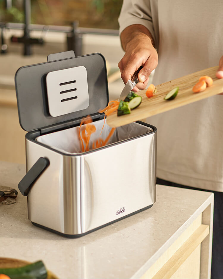 Idealerweise halten Sie einen kleinen Lebensmittelabfallbehälter für die Arbeitsfläche drinnen für den täglichen Gebrauch und Ihre größere, von der Gemeinde bereitgestellte Lebensmittelabfalltonne draußen (diese sind in der Regel 23 Liter groß, was ausreicht, um ein oder zwei Wochen Lebensmittelabfälle aufzunehmen). Lebensmittelabfallbehälter für den Innenbereich sollten am häufig genutzten Ort positioniert werden: das kann auf der Arbeitsfläche oder in einer Schranktür in dem Bereich sein, in dem Sie die meisten Lebensmittel zubereiten. Alle unsere Joseph Joseph Lebensmittelabfallbehälter haben Griffe, die das Bewegen in der Küche beim Arbeiten erleichtern.