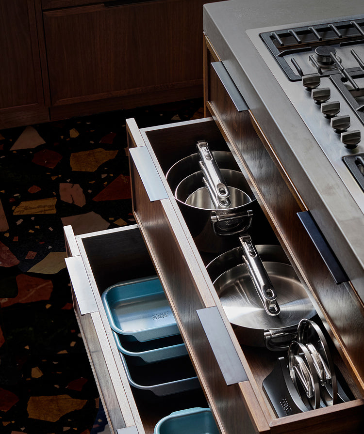 Unsere Space-Kollektion ist stapelbar und die SwingLock™-Griffe klappen ein für ein noch effizienteres Aufräumen. Keine unordentlichen Schränke mehr.